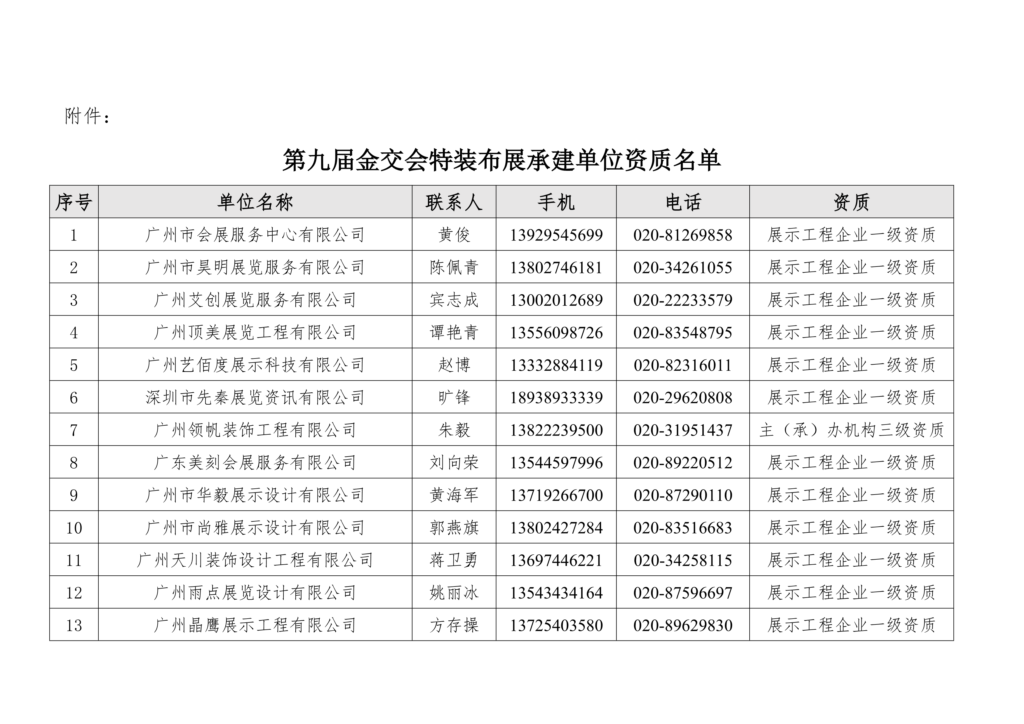 为规范展馆管理、确保安全、提高整体布展水平,根据展馆的相关规定,对本届“金交会”推荐特装布展承建单位实行资质认证。现将第九届金交会特装布展承建单位资质名单公布予以公布。