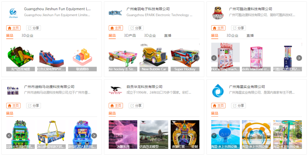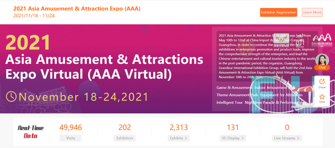 为了鼓励更多的广州中小外贸企业参与,链接国内国际两大市场,2021云上AAA入选2021年广州市开拓国际市场重点线上展会推荐目录(7-12月)。在可期的市场前景与政策红利的加持下,本届云上展会吸引了202家企业布局参展,集中展示室内乐园、主题公园、景区装备、文化旅游等领域的热门产品及解决方案,展品达2313款。