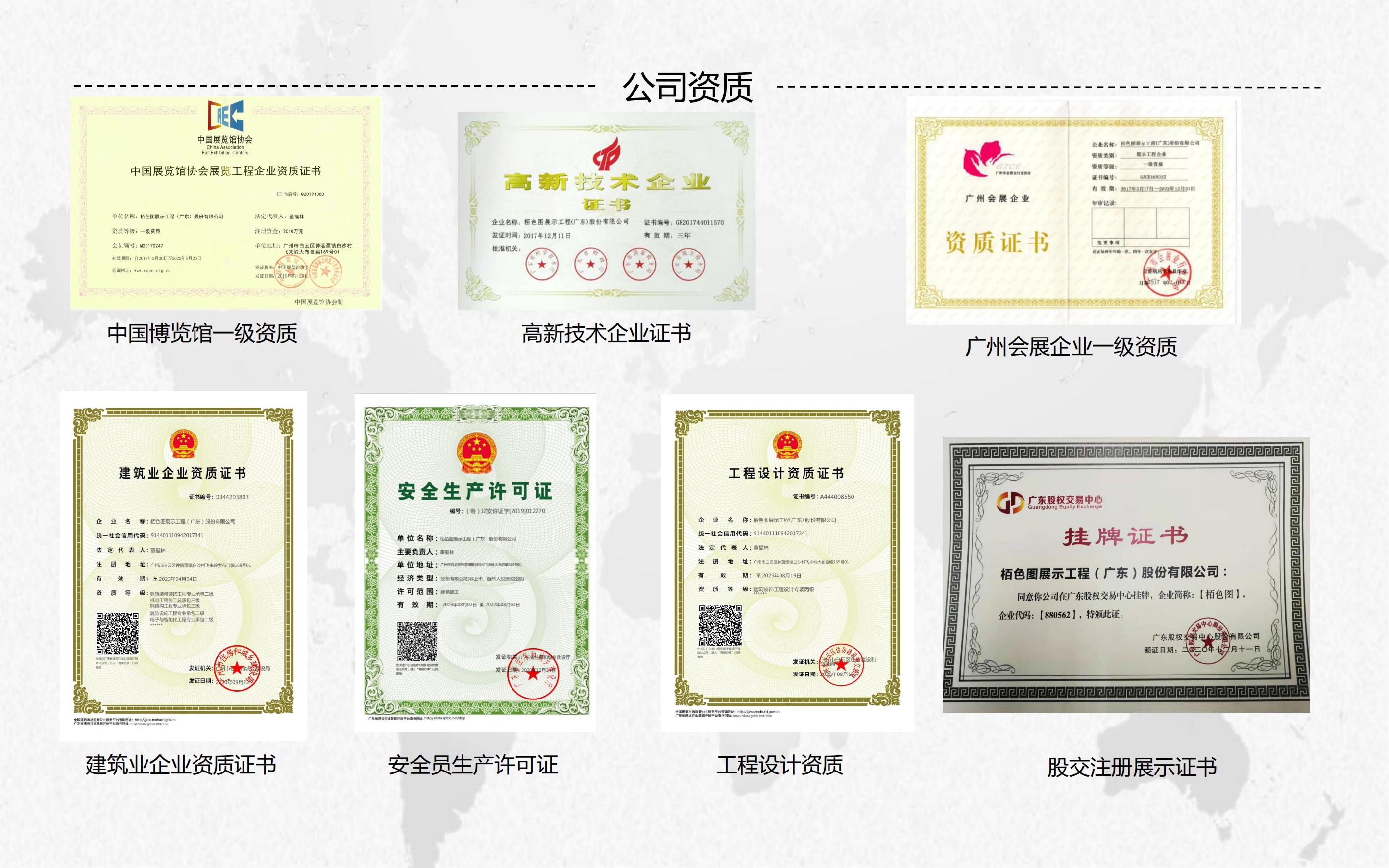 2017年栢色图展览被广东省认定为高新技术企业,是广东展览业仅有的几家具有高新技术的展览服务公司之一。提供从信息咨询、展示设计、视频制作、3D全息投影技术、工程制作、搭建拆卸到现场执行的全程服务,可以量身制定一整套融合客户企业文化及营销策略的展示方案,给予客户最优质的服务。
