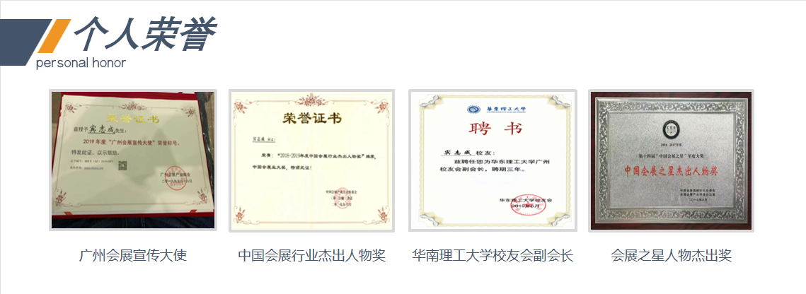艾创展览董事长宾志成为华东理工大学管理工程系工程类学士,具有专业的展览咨询和活动策划能力,有16年广交会设计搭建经验,21年会展行业客户服务与管理经验,对汽车行业4S店的设施环境设计、项目管理和展览会特装等具有丰富的经验,并荣获广州会展宣传大使、中国会展行业杰出人物奖、会展之星人物杰出奖、改革开放四十周年广州会展领军人物奖等多项荣誉。
