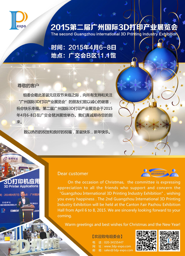 第二届广州国际3D打印产业展览会将于2015年4月6-8日在广交会琶洲展馆隆重举办!在圣诞元旦双节来临之际,预祝大家节日快乐!