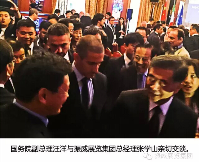会后汪洋副总理接见了中纺集团、北京首都农业集团、振威展览集团等企业代表。当与代表们亲切握手时,听说振威展览集团总经理张学山来自广东省,汪洋副总理风趣的说,那我们算是老乡了,我在广东工作过多年,希望展会在国际交流与贸易合作中,起到桥梁和纽带作用。