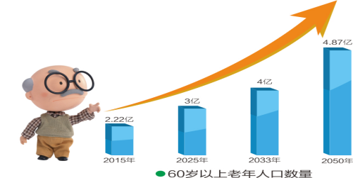 截至2015年底,我国60岁以上老年人口达到2.22亿,占总人口的16.1%,2050年前后达到峰值4.87亿,占总人口的34.8%。据目前测算,中国养老市场的商机大约有4万亿元人民币,到2050年间,中国老年人口的消费潜力将增长到106万亿元左右,占GDP的比例将从8%左右增长到33%左右。随着我国人口老龄化程度不断加深,老年人生活照料、康复护理、精神文化等养老服务需求日益增长,我国将成为全球老年产业市场潜力最大的国家。